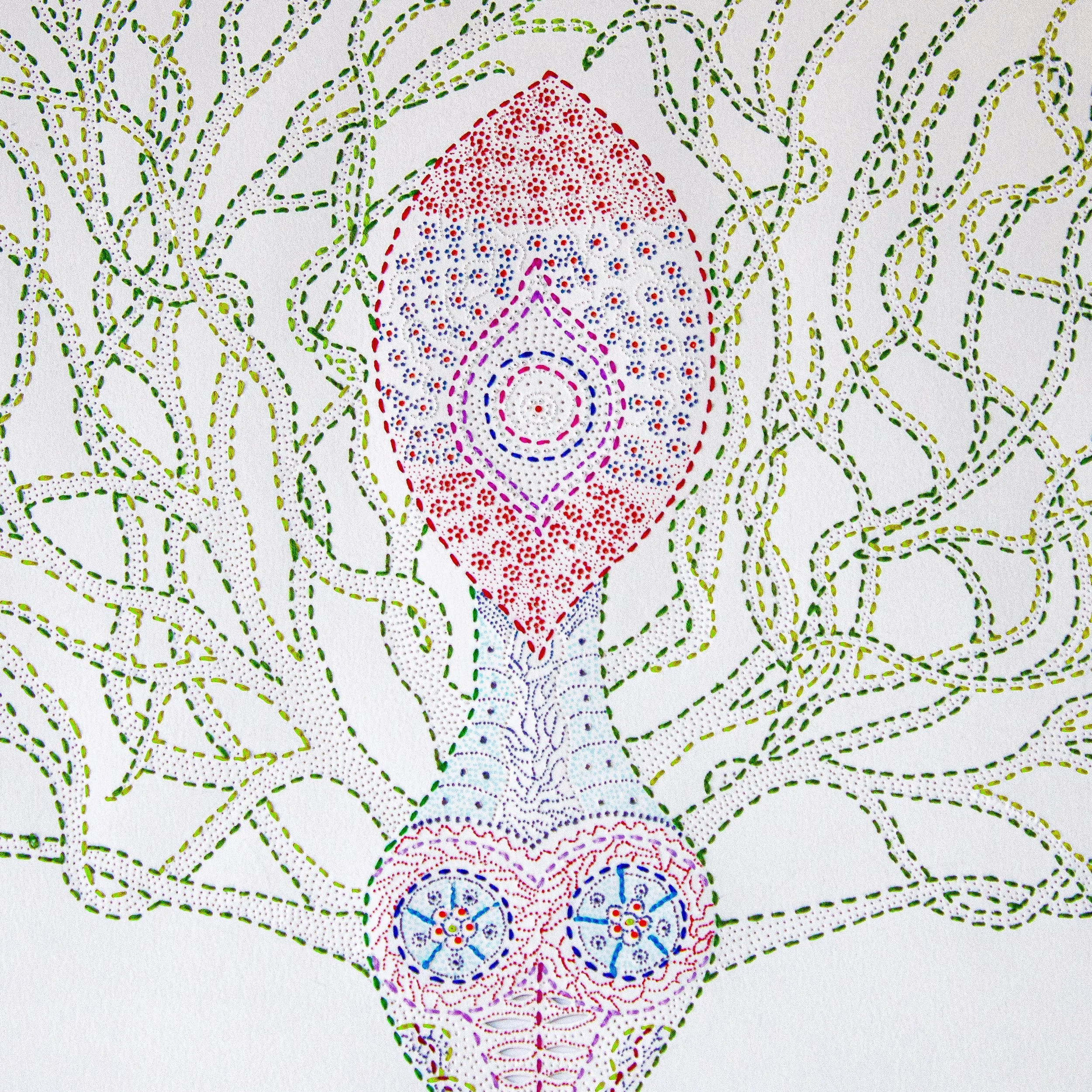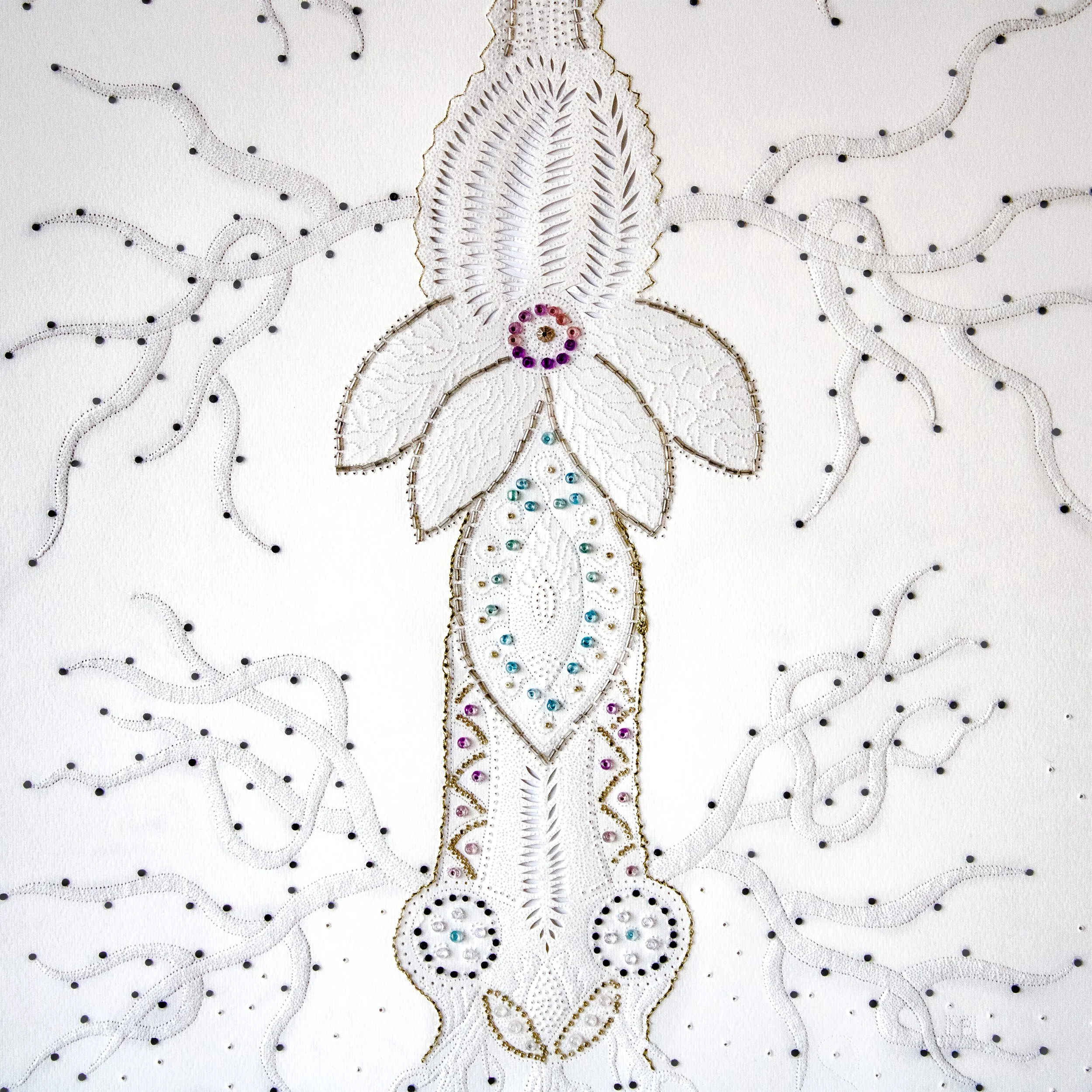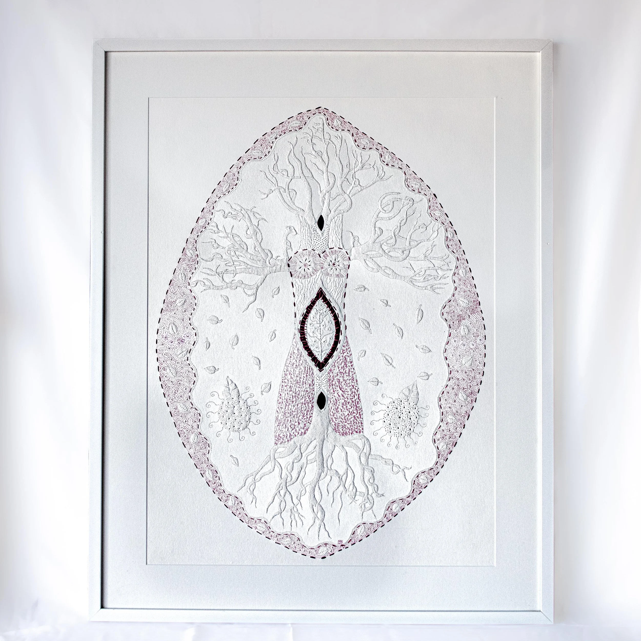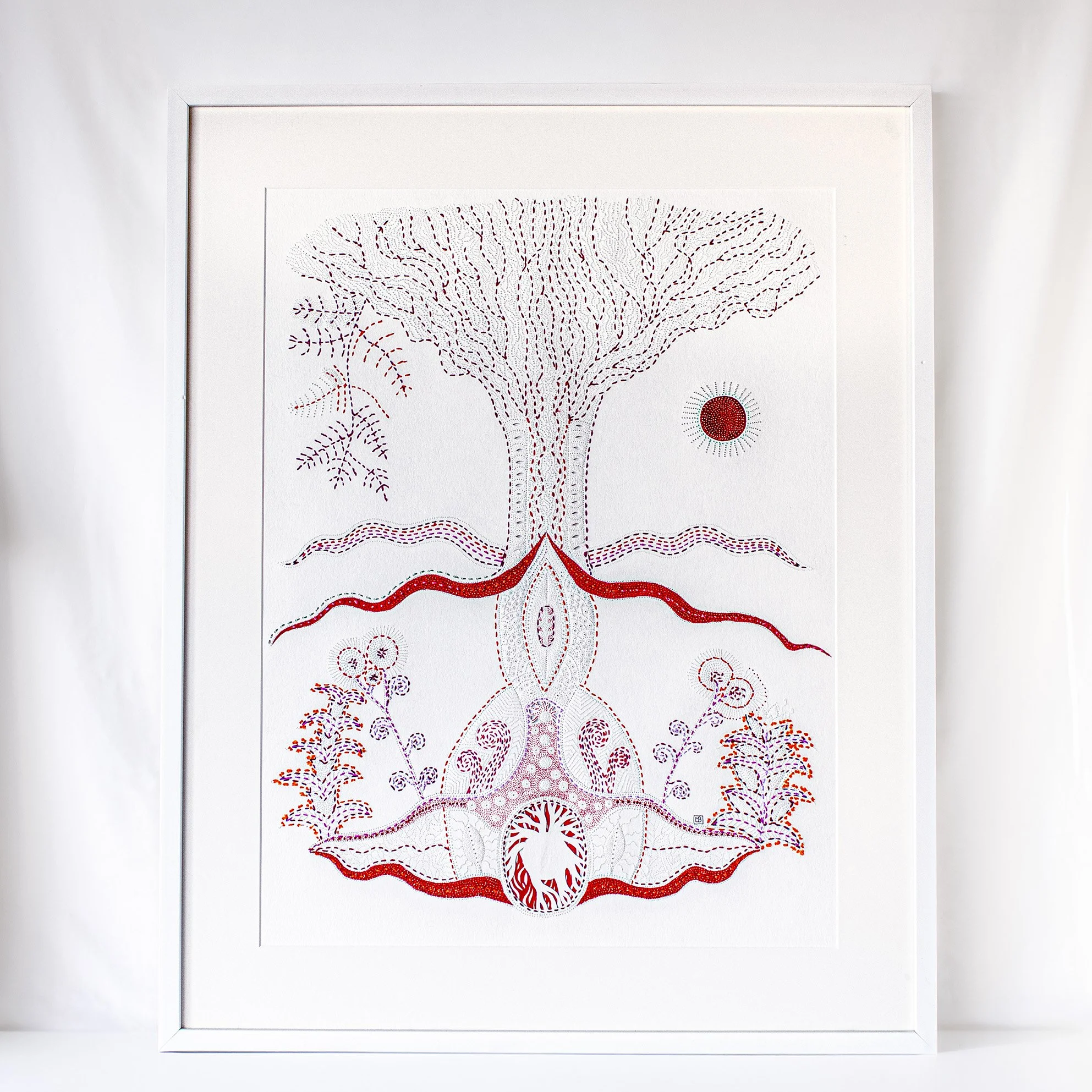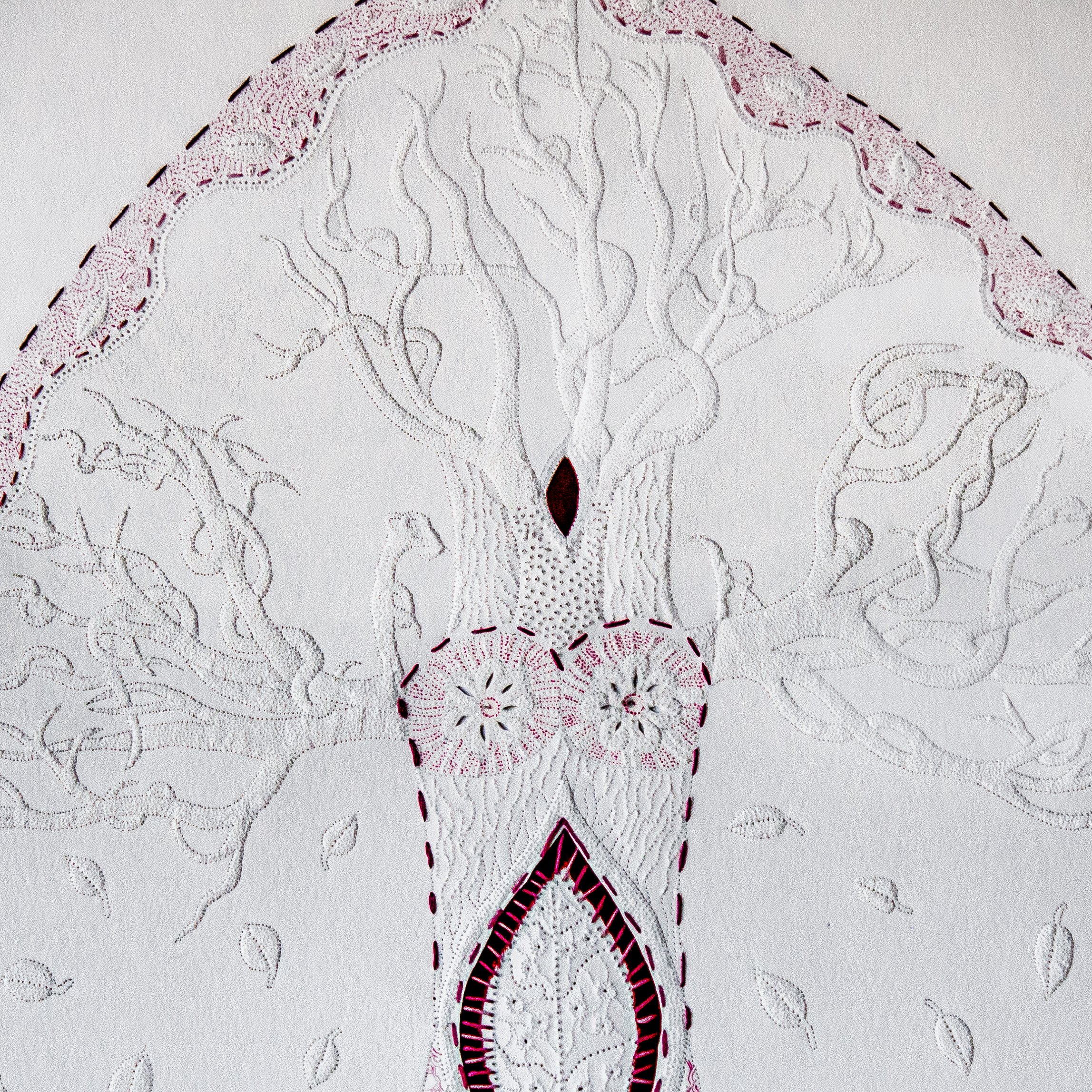I am interested in creating narratives and images that reflect my interest in poetry, myth, rituals, and a sense of the sacred, in order to forge a spiritual atmosphere for meditation. In this category of work, I mostly question the boundaries between human beings and nature, particularly the intertwining of trees and the female body. These pieces imagine the transcendent meeting of the two, exploring themes of in-betweenness, safety, and existence between the sky and earth. The branches and roots of the tree are real, but between the two, in the trunk, is where I am reminded of human beings. I envision the trunk of a tree like a womb, a sanctuary. Without the literal or symbolic trunk, the tree cannot sustain itself or others. The trunk itself is sacred, as are women.